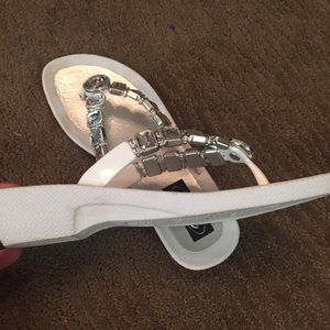 White bejeweled flip flops