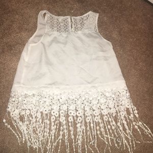 This is a white no sleeve dress shirt with a cute fringe on the bottom. Perfect to wear with jeans! :)