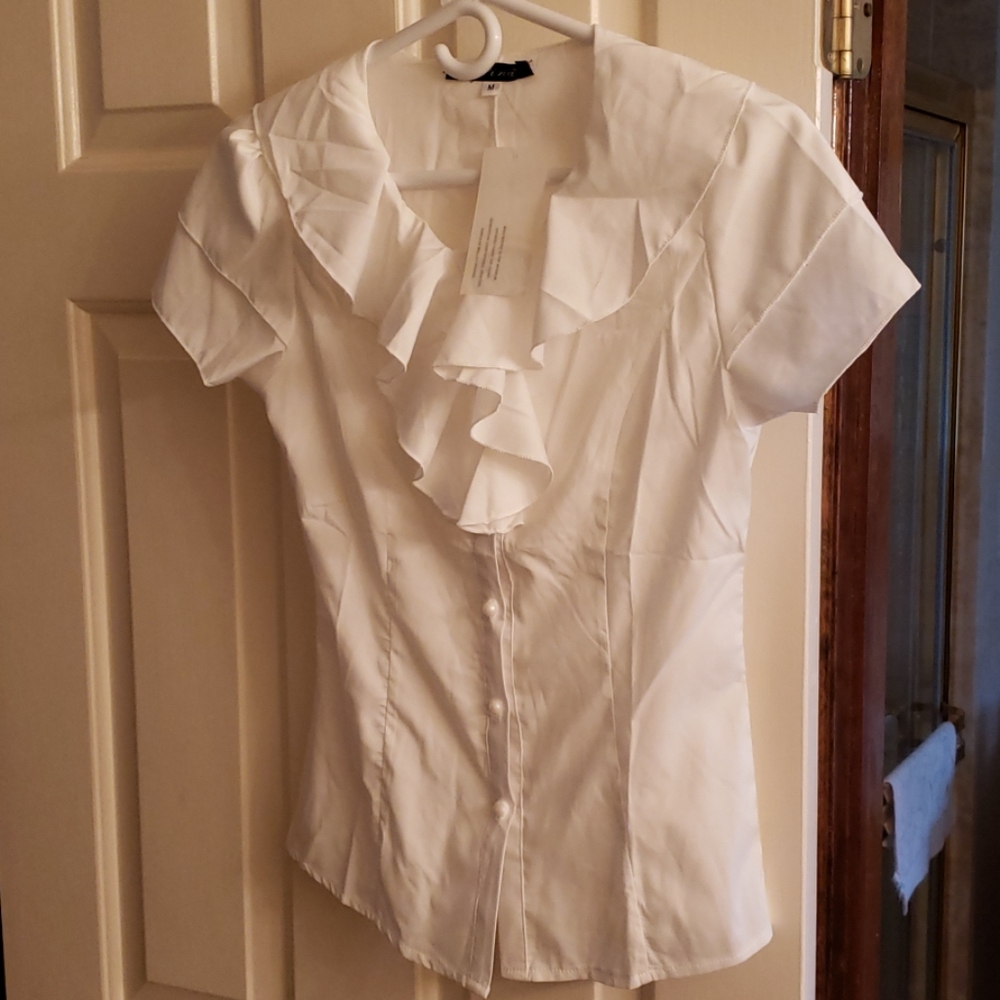 Ruffled white button down short sleeve blouse. Fits like a small. Brand new.