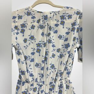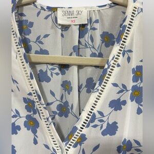 Listed is a white blouse with a blue floral pattern, by Sienna Sky. The blouse features a V-neckline with lace trim, short sleeves, and a cinched waist with a tie-front detail. The floral pattern consists of small blue flowers with yellow centers scattered across the white fabric.