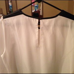 This is a white blouse with black faux leather on both shoulders and sleeve trim. Never worn! Not sure where I got it! Not really sure how much it was either but I am doing a price I think I would pay for!