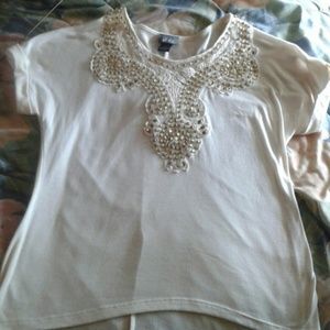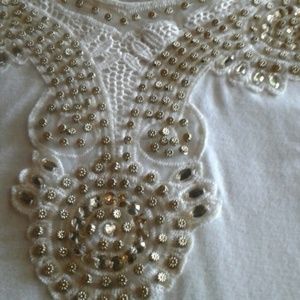 A while loose fitting white blouse with golden gems and beading around the neck line. Never worn! In mint condition
