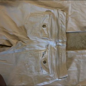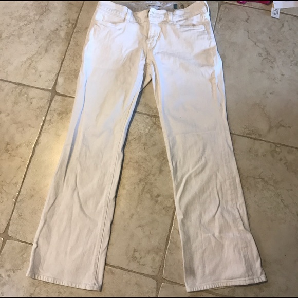 Curvy style white bootcut jeans. 2 buttons and zip fly closure. Some small stains but probably could be bleached out. Priced accordingly.