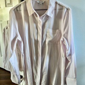White button down. Lightly used. Polyester, feels quite soft like silk almost. Business casual. (This picture is bad)