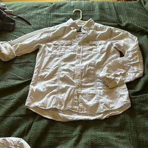 Men long sleeve button down shirt. Light gray thread design. Sleeves roll up with button closure as shown, or leave long. Sharp looking shirt. Size small