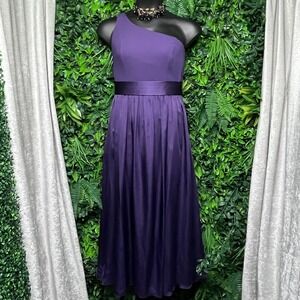 Keywords: White by Vera Wang, one shoulder dress, midi dress, purple dress, formal dress, party dress, cocktail dress, wedding guest dress, size 12, womens dress, evening dress, special occasion dress, aline dress, satin dress
