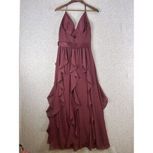 White by Vera Wang Maxi Dress Women 4 Wine Ruffle Halter Bridesmaid Formal Gown