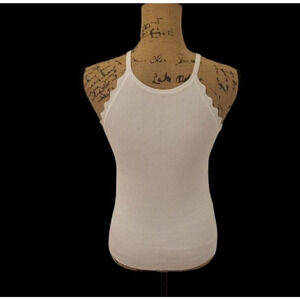 This Amazon brand white cami top with small scallops size s/m is a perfect addition to your wardrobe. The top features a solid pattern and is sleeveless with a round neckline and spaghetti straps. It has a pullover closure and is made with strappy sleeves. The camisole is white in color and has accents of scalloped design. It is perfect for travel, party/cocktail, casual, formal, workwear, and business occasions. The garment care instructions are to hand wash only. This tank top is perfect for the summer and spring seasons.
