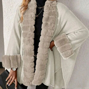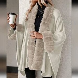 White cardigan with fluffy trim, dolman sleeves, chic, elegant, modern