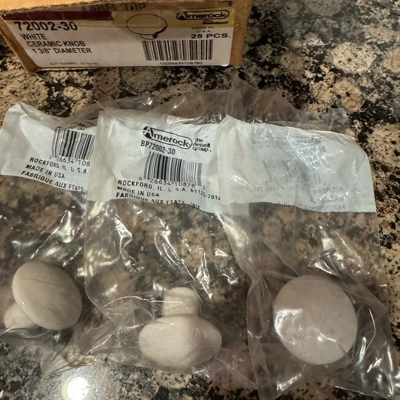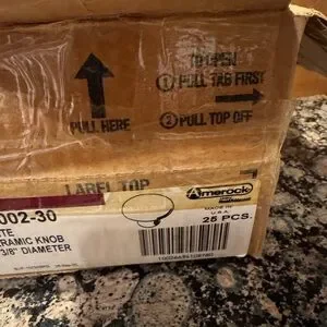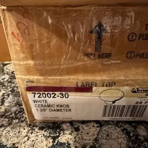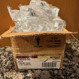 NWOT box of white ceramic knobs. 1 3/8” in diameter. Box says 25 pieces but there are 27. Each knob is sealed individually with a screw. Perfect for kitchen or bathroom cabinets. Excellent condition.