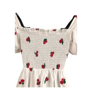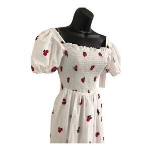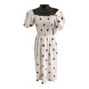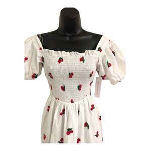 White cherry print puff‎ sleeve doen look smocked cottage dress size medium new