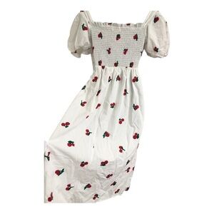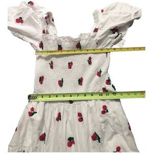 White cotton cherry print prairie doeb style puff sleeve smocked dress size medium new what a sweet feminine summer dress can be worn slightly off shoulder or right on shoulders beautiful cherry embroidered print about knee length cottagecore farmhouse doen Rolande dress smocked bodice stretches up to 19-20 prairie vibes 0991 a197 White cotton cherry print puff sleeve smocked dress size medium new