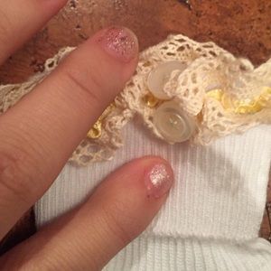 White children's socks with white buttons and off white lace with yellow ribbon. These are $4.00 or free with other purchase because buttons were seen on same side. I don't think it would be noticeable when on though. Still very cute! Made for a fundraiser.