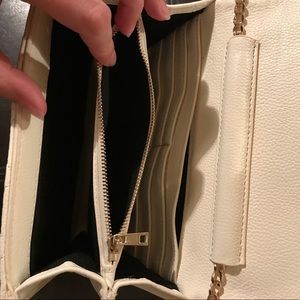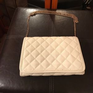 White textured clutch converts into a shoulder purse. Easily hidden stylish gold chain strap. Very spacious with many compartments and a card organizer for convenience. About 8" w x 5"h x 3" depth. Never been used - perfect condition. Interested in selling $11 or best offer.