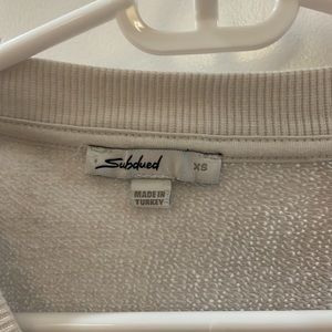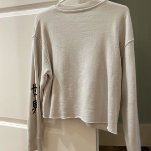 This isn’t fully cropped but you can see it is shorter than your average shirt. It’s loose fitting! Very cute! Bought it on vacation in LA and never worn it since.