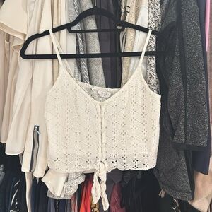 Sheer at back, lined at front crop top withh adjustable straps and tie at front. 100% cotton.
