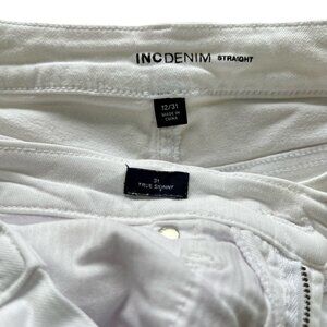 These will be your go everywhere white denims for this spring and summer. Measurements are pictured. As far as flaws, the "INC straight" has a bit a wear in the inseam plus a yellow spot on the front left leg (Visible in the picture that shows the leg measurement). The "Gap true skinny" has some yellow-ish spots in the back, (hard to see in the pictures). Overall you are really getting a couple nice pair of pants for one price. They are ready to ship and from a smoke free home.