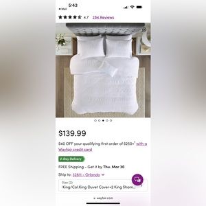 Pics are shown on a California King bed. Duvet cover is short on sides. Would fit a king or queen better. King size shams never used and decorative pillow is still in original packaging. Set was bought from Wayfair. Attached their pictures to show detail of fabric. Also attached their spec sheet. Set is 4 months old and used for one month.