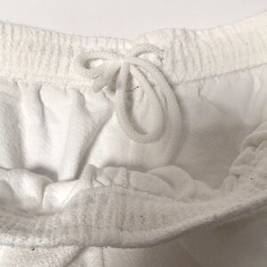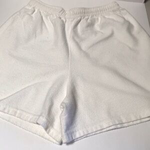 White elastic waist shorts with inner drawstring. Waist: 26 inches. Inseam: 4 inches. No brand or care labels. Thick, quality fabric.