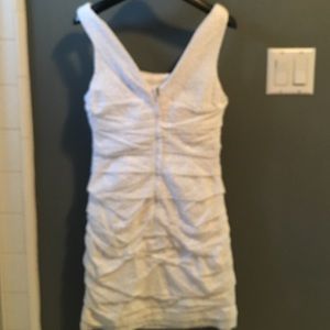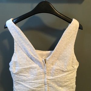 Adorable short white floral less dress with layered ruching. 100% cotton shell wothb96% polyester and 4% spandex satin liner. Super comfortable, flirty dress. Worn once.