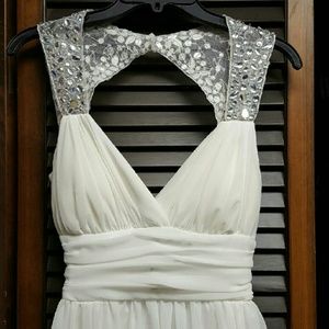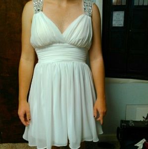 Short white dress with beaded top. Flows well and is really flattering. Never worn before so it's in perfect condition. Size 5 but runs a bit small. The dress is a little long for my torso because I am 5 ft. tall.