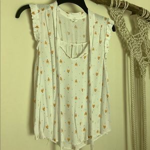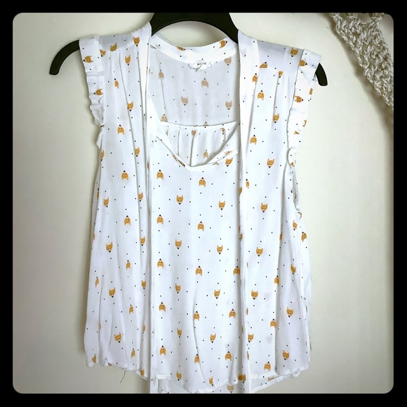 This white fox patterned blouse has only been worn once. It has cap sleeves, and an optional tie closure on the front. It says large but it runs small, and is likely to fit people who are sizes 2-4.