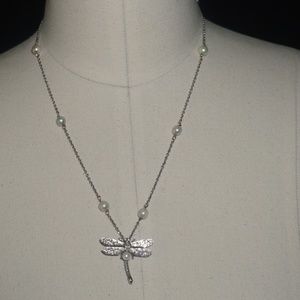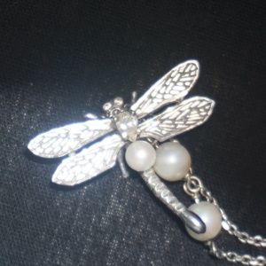 Deco inspired chain contains 8 (approximately 5 cm) cultured pearls spaced throughout the 18" chain (9" drop). The dragonfly measures 1.2"across the wings and 1" length head to tail