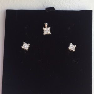 Brand or maker unknown. Small diamonds with white gold. Matching studs and pendant.