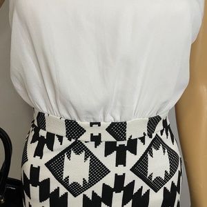 White halter chiffon like top w black white ikat patterned fitted mini skirt!