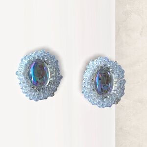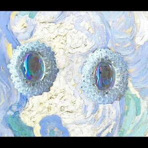 Photos don’t begin to capture the ever changing rainbow of colors in these small but magnificent earrings. European glass ab cabs surrounded by ab crystal glass beads. Classic design with a sparkling touch. New vintage stock, hand made by Sonoma jewelry designer Lisa Jo Silberkleit. Artist statement included. The earrings measure approximately.75” in both length and width. Please see all photos for full description.