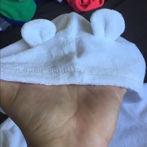 Size 6 months white jacket, with little ears. Very cute not stains. My son doesn't fit it anymore.