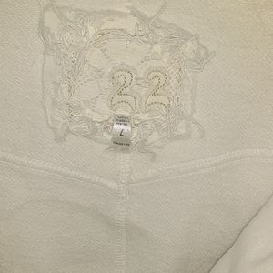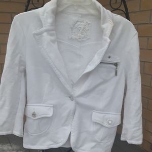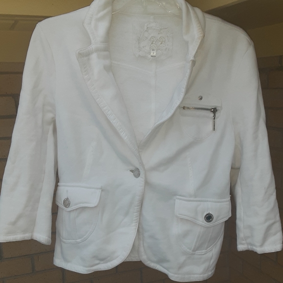 All white 100% cotton. Three detailed pockets with silver zipper and buttons. Size L fits S-M.