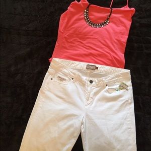 White jeans with metallic embroidery on back pockets and front side pocket. Purchased at Steinmart NWT. Inseam measures 35 inches! (Too long for me – was going to have them hemmed and never got around to it!)◻️ 98% cotton 2% spandex. Mid Rise Relaxed Wide Leg. Robertson. Made in USA.