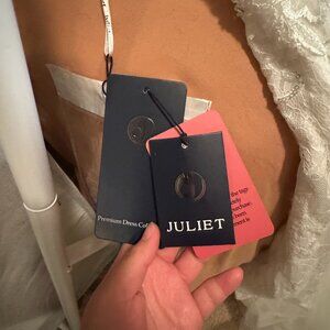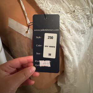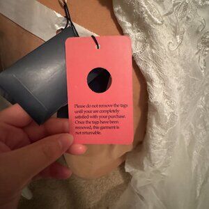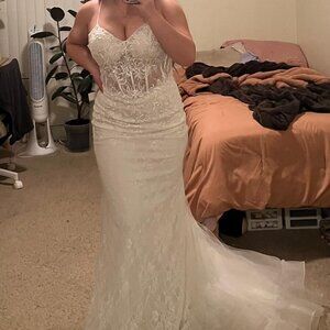 My roommate decided to go with another dress! brand new with tags, never worn out, only to try on. person in pic 3 is about 5'0. Beautiful lace and embroidery throughout dress and solid boning in the corset. Originally 500. open to offers!