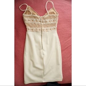 White and cream form fitting dress, expandable material, mid-thigh length, practically new!