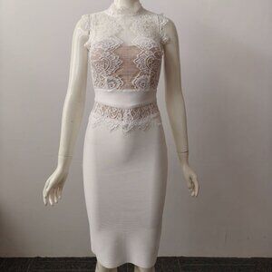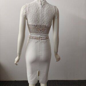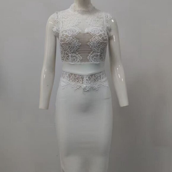 White lace dress with cutouts, tight-fitting bodycon mini skirt