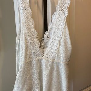 White lace low cut tank top, size medium, lace up in the back, worn but no damage.