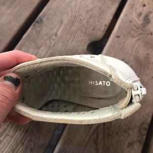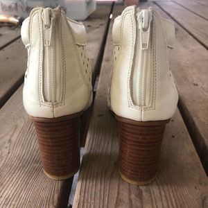 White leather and wooden heel boots by Japanese designer Tsumori Chisato.