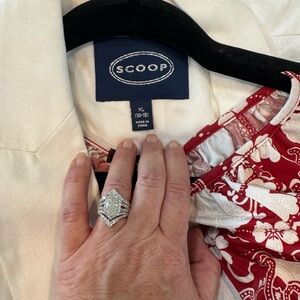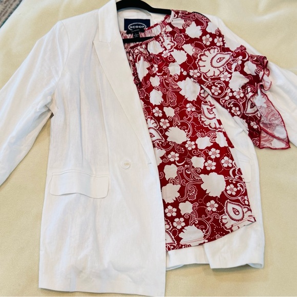 Stylish white blazer featuring a vibrant red and white flowy blouse. Perfect for adding a pop of color to your outfit. Will separate the blazer from the top I have many more that go well with or dresses that would look amazing. Blazer is an xl and top is a large.