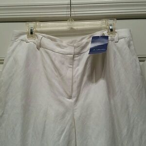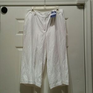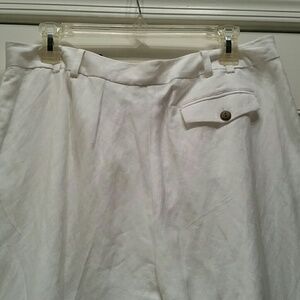 White linen capris fully lined 2 front pockets one back pocket approximately 32 and a half inches from waist