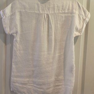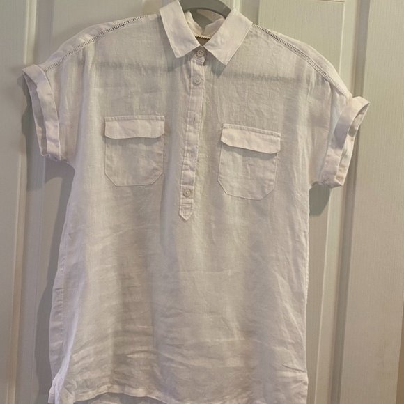 Pretty white linen short sleeve collar shirt with two pockets on front. Pretty stitching detail on shoulders.