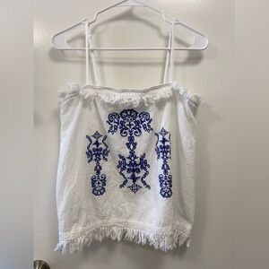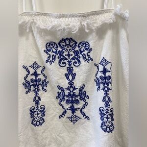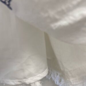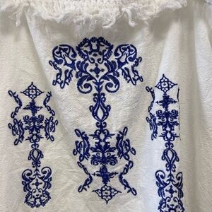 White and blue no brand feels like linen embroidery w fringe so cute! Size prob small to medium women’s. Similar to main pic