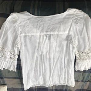 White long tunic with crochet inlays, Size Small, 100% cotton, dry clean only, no stains, tears or snags. 3/4 sleeves. 28" long. Great condition