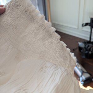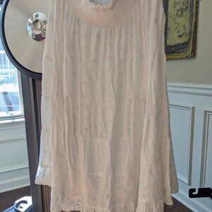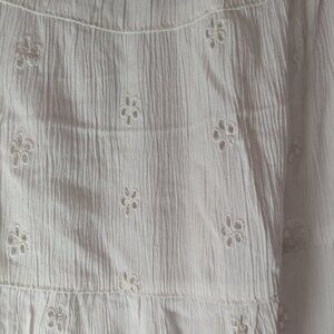Beautiful long white maxi skirt. Has delicate cut out flower design. Skirt has half slip attached. Size large. Fully elastic waist I believe would fit a L to XL. It does have a few loose strings but nothing noticeable or in spots that them hem will fall apart.