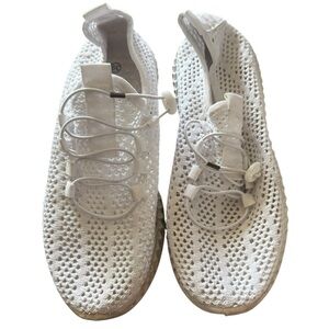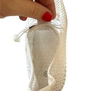 White mesh slip-on sneakers with red grippy soles and toggle laces. Size 39 EU (fits US women’s 8–8.5). Lightweight, breathable, and perfect for summer.