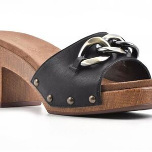 The bigger the better. The Jem Footbeds heeled sandal by White Mountain Shoes steals the scene with an oversized chain, retro inspired faux wood clog heel and nailed stud details. A cushioned insole provides maximum comfort for all day wear.