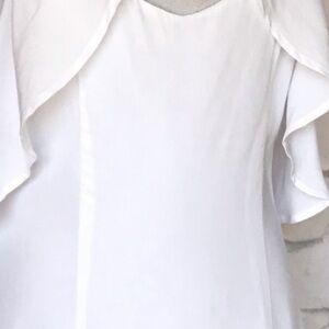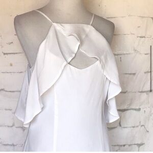 BB Dakota White Off The Shoulder Ruffle Drape Dress NWT Size 6 BB Dakota White Kales Ruffle Drape Dress Size 6 Brand new with tags BB Dakota white ruffle drape mini dress very feminine and flowy * Off the shoulders * Cut out the neckline * Spaghetti straps * Rear hidden zipper * Fully lined * Armpit to armpit measurements 17" * Length measurement 31" Very faint discoloration on the front, only noticeable is certain light - shown in the last picture in the middle of the picture 2205 BB Dakota cold shoulder ruffle dress