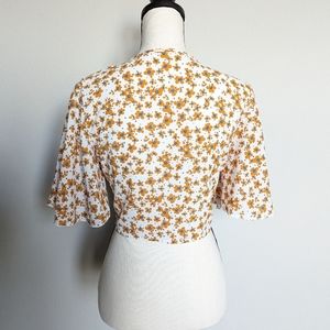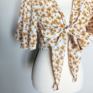 White orange and blue floral flounce sleeve cropped tie front top size XL