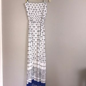 White and patterned strapless dress. Buttons all the way down. Blue trim on bottom. Chinches at waist with tie. 100% rayon