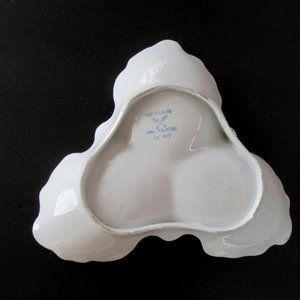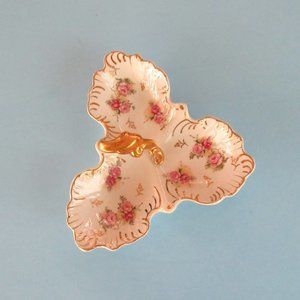 Lovely dish is perfect for candies, small cookies and petit fours. The piece is 9 1/2" point to point and is in excellent condition with minor aging and wear. Please see all photos and feel free to ask any questions. The piece is marked Porcelaine Hand Painted 55/1817 with crossed arrows. Crossed arrow mark was used by several manufacturers such as Arnart, but this piece is not marked with a name. Most had paper tags which were removed. We suggest hand washing for this piece to avoid damage to the pattern and gold leaf trim.